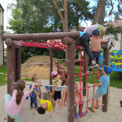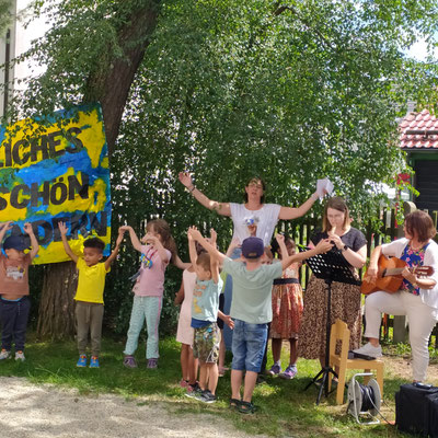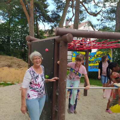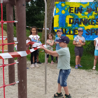 Inmitten einer lachenden Kinderschar lauschten alle Beteiligten den extra einstudierten Darbietungen der Kindergartengruppen und beobachteten danach die Kinder noch eine Weile beim Spielen und Erobern ihres neuen Klettergeräts.